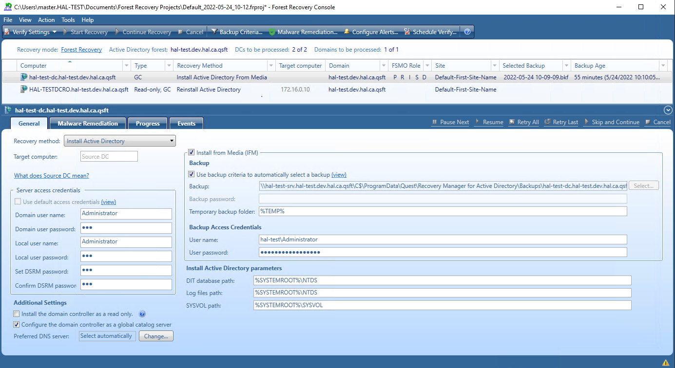 This area provides a list of all domain controllers in the current recovery project along with some basic information about each domain controller, such as domain controller name, domain, site, FSMO roles, specified recovery method, recovery pause status, and currently selected backup (if any) and its age.
