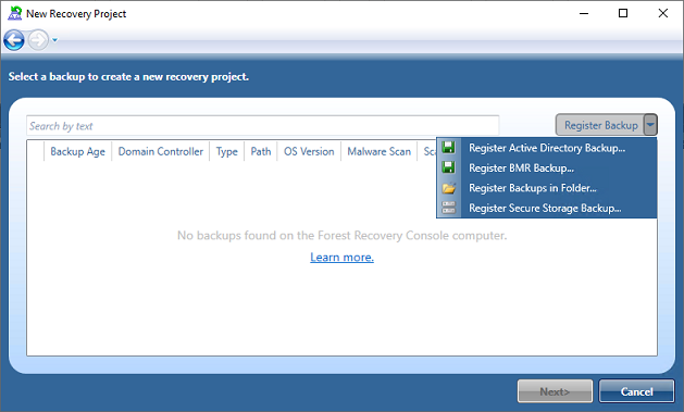 The registering of backups from New Recovery Project dialog in Forest Recovery Console, will automatically execute an integrity check when backups are registered using Register Active Directory Backup…, Register BMR Backup… and Register Backups in Folder… options.