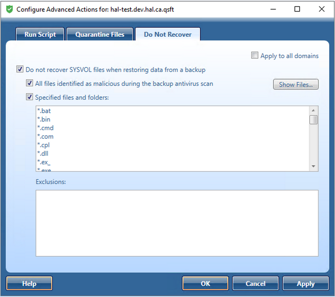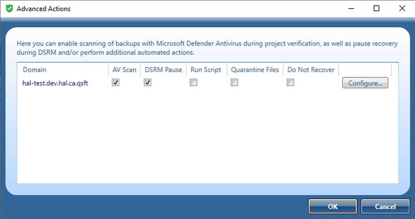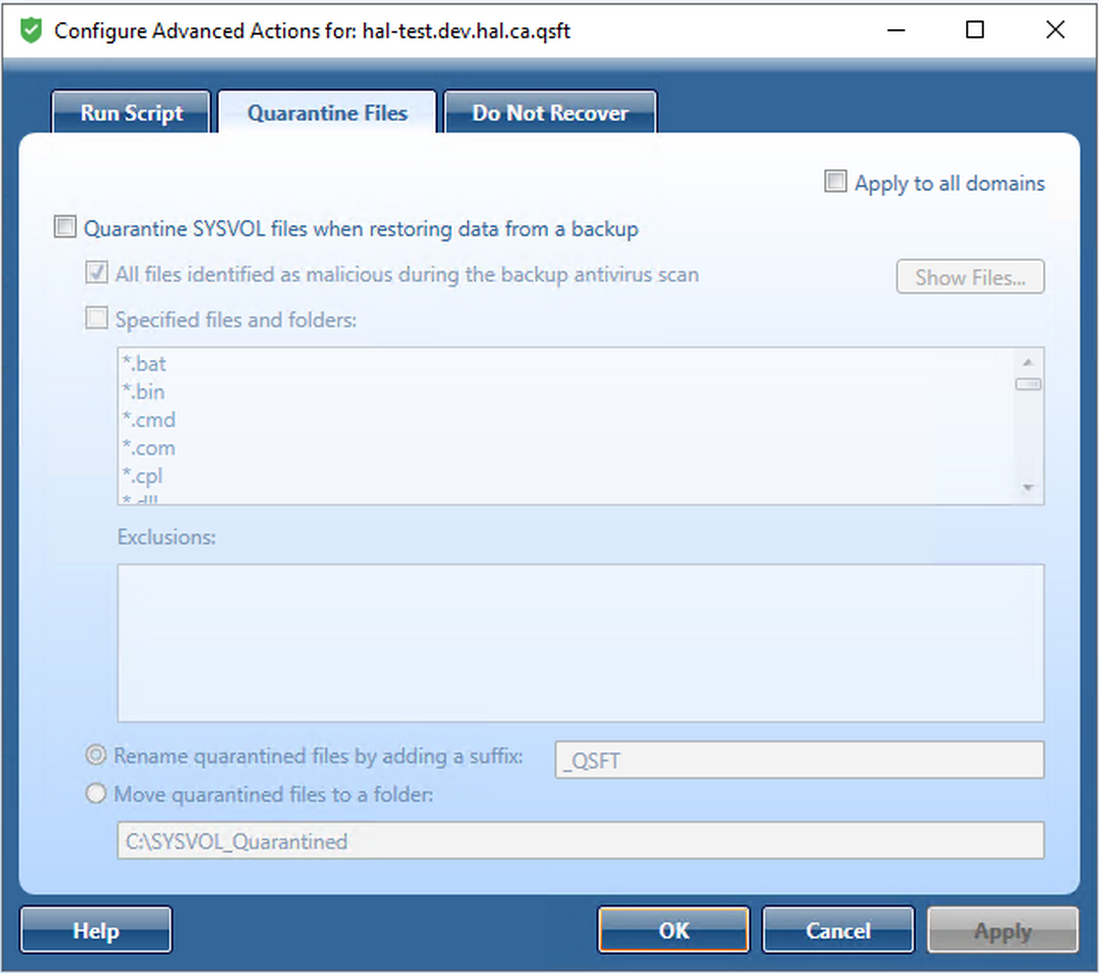 To select all of the domain controllers in a domain or forest to be paused during recovery in DSRM mode, select Configure by domain and select a domain or multiple domains within the forest. To configure Run Script, Quarantine Files, Do Not Recover select any or all of the three and click on the Configure button.
