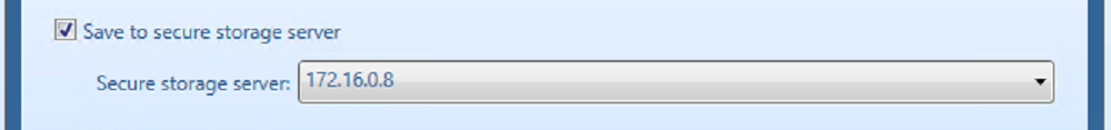 2. Selecting the Secure storage server check box, you can specify a server to store the configuration backup. If more than one secure storage server is available select the server you wish to use from the drop down. Secure storage servers are configured in the RMAD console.