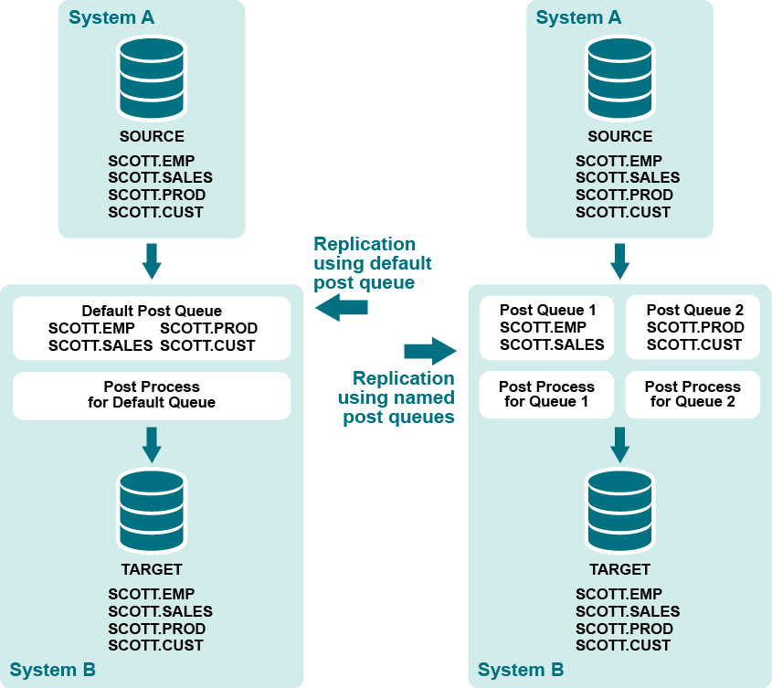 The following configuration creates one post queue named Queue1 that routes data from table scott.emp and another post queue named Queue2 that routes data from table scott.cust.