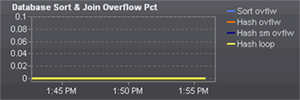 The Database Sort & Join Overflow Percent graph relates the number of sort and hash join overflows to the total number of sorts and hash joins, respectively, performed in the database. These ratios, expressed as percentages, are determined for the database over consecutive monitoring intervals and are shown in the following series: