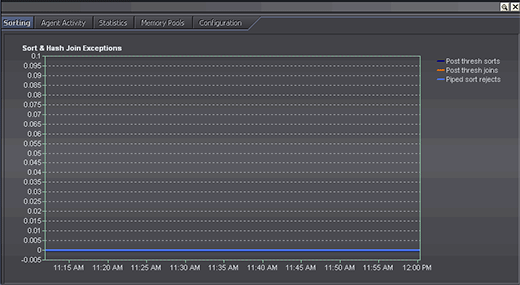 The Sort & Hash Join Exceptions graph tracks the total number of sort and hash joins that operated in less than optimal environments in the database during consecutive monitoring intervals. These sort and hash joins, known as exceptions, are likely to impact sort performance negatively. The totals are shown in the following series: