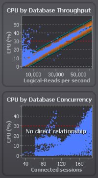 However, Spotlight's analysis determines that the apparent relationship in the Concurrency chart between CPU and connected sessions only reflects the real relationship in the Throughput chart between CPU and logical reads per second.
