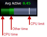 Average Active Sessions shows the sum of DB time over all sessions, divided by elapsed time. The Average Active Sessions gauge breaks this down further by showing CPU time (dark colored bar) and other time (light colored bar) in relation to the CPU limit (vertical white line).