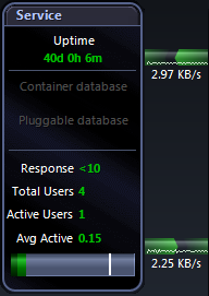 Average Active Sessions can help you determine if a database is experiencing performance issues. A value greater than the CPU limit, indicates potential performance issues. This is shown on the Average Active Sessions gauge as either of the colored bars passing the vertical white line. How far the colored bar has passed the vertical white line indicates the severity of the performance issue. A value far greater than the CPU limit indicates that the database is experiencing bottlenecks.