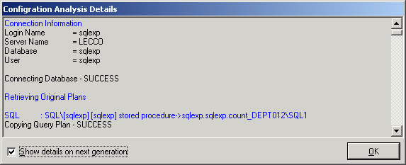 The Configuration Analysis Details window displays information about the retrieve of the query plan for each SQL statement.