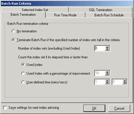 The Batch Termination page of the Batch Run Criteria window is used to determine if and when to terminate the Batch Run. It enables you to find alternative SQL statements that give you good performance improvement without having to execute every SQL alternative.