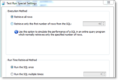 • Select the Test Run Special - Current option to test run the alternative. The Test Run Special Settings dialog opens where you can specify the number of records to retrieve and the number of times to test run the alternative.