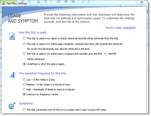 • Simplify the process of selecting test run settings by answering three questions about your original SQL. SQL Optimizer automatically determines the best test run settings based on your answers.