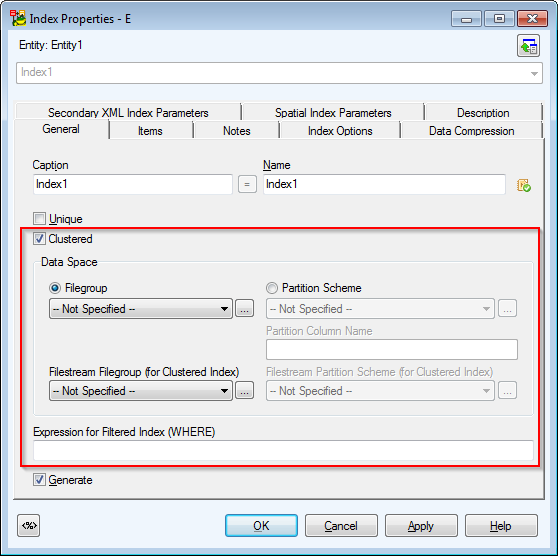 Possibility to define Filtered Index in the Expression for Filtered Index (WHERE) box.