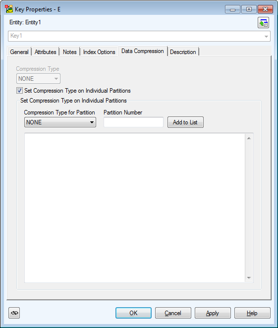 On the Data Compression tab, you can set Data Compression either for all key (combo box Compression Type) or for particular partitions. (To accomplish this, it is necessary to select checkbox Set Compression Type on Individual Partitions and fill out the box in the Set Compression Type on Individual Partitions area. See the auxiliary combo box Compression Type for Partition, box Partition Number and button Add to List).