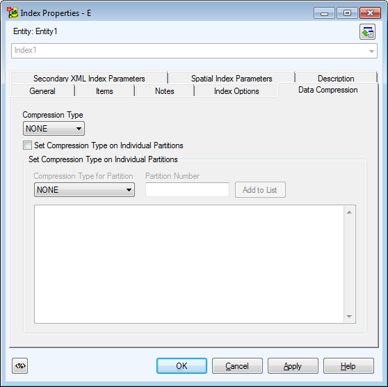 On this tab,  you can set Data Compression either for all indexes (combo box "Compression Type") or for particular partitions. (To accomplish this, it is necessary to select checkbox Set Compression Type on Individual Partitions and fill out the box in the Set Compression Type on Individual Partitions area. See the auxiliary combo box Compression Type for Partition, box Partition Number and button Add to List).