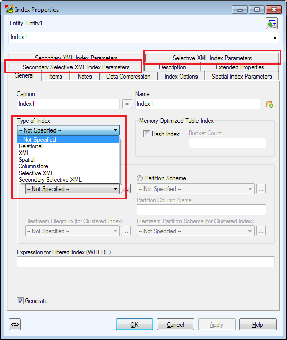 • New Index types available in Index | General | Type of Index - Columnstore, Selective XML, Secondary Selective XML