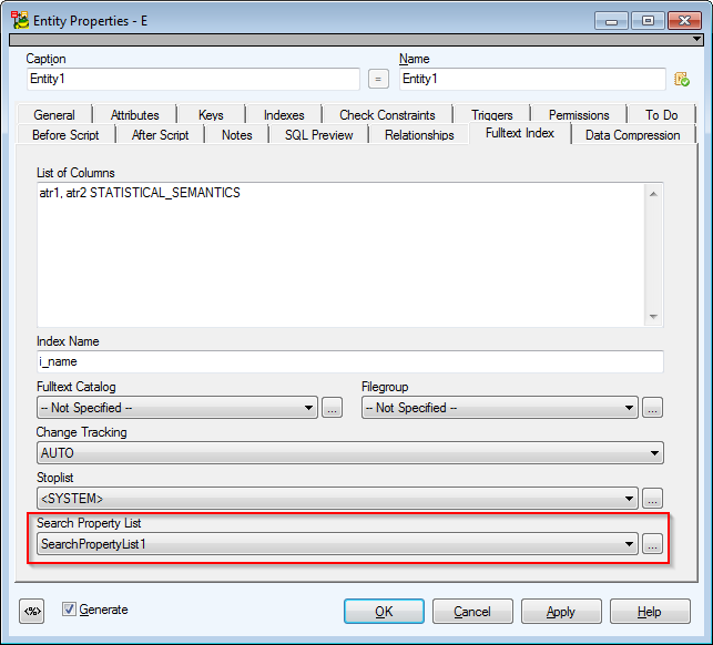 • Stoplists - Similarly to Filegroups, Stoplists work in Toad Data Modeler only as a list. During script generation, the Stoplist definition is not generated and during reverse engineering  the definition is not loaded either (only names are loaded).