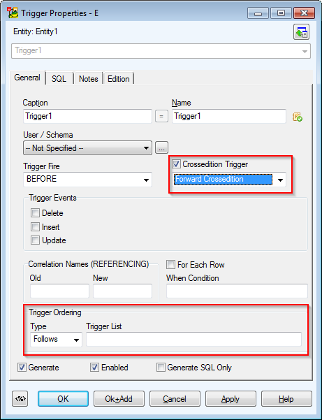 Parameter CROSSEDITION - Select the Crossedition Trigger checkbox to display a combo-box with options Not Specified, Forward Crossedition, Reverse Crossedition.