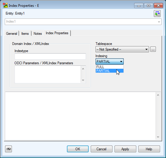 • INDEXING ON/OFF option for partitioned tables, for both whole table and individual partitions. Table Properties tab is used for this option. It is also loaded there during reverse engineering.