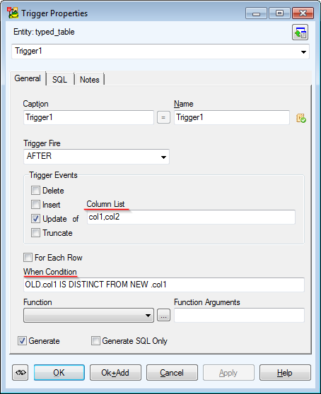 New Column List box available for trigger event Update (Update checkbox must be selected).