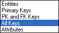 From the Display Level dropdown menu on the Display Toolbar, select Primary Keys or PK and FK Keys or All Keys.