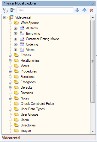 The contents of Model Explorer depend on type of your model (Physical/Universal/Logical) and used database platform and version.