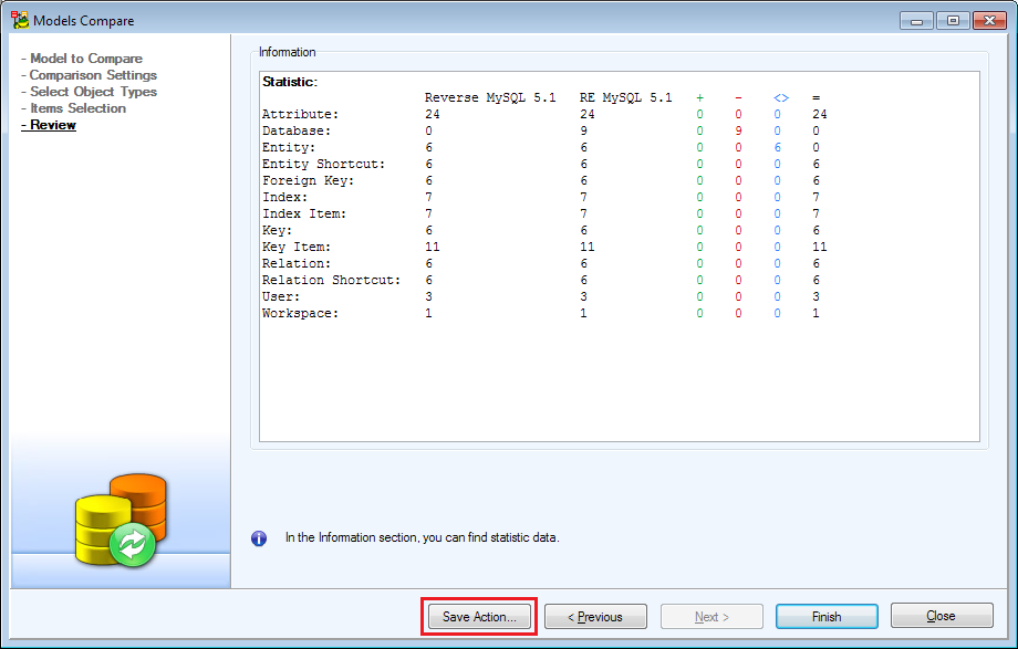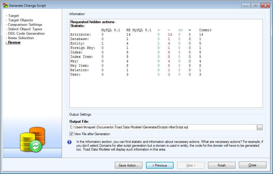 8. Review your comparison. You can set your own path for change script output file here. Click Save Action to save the comparison as Model Action for repeated use. See Model Actions for more information.