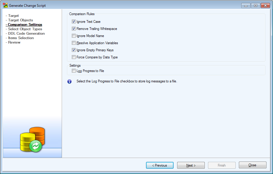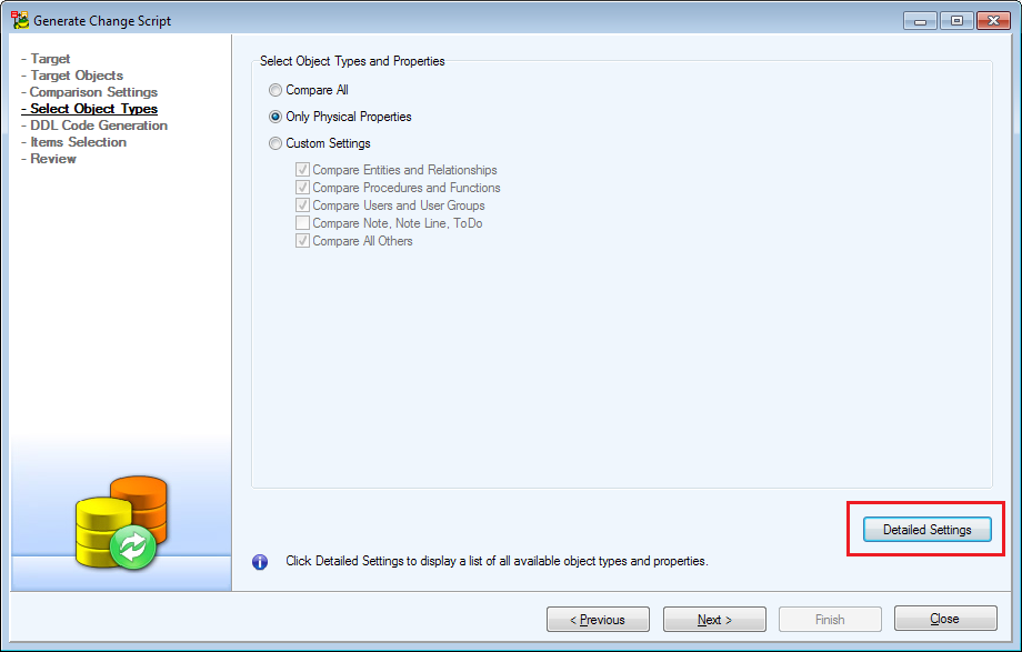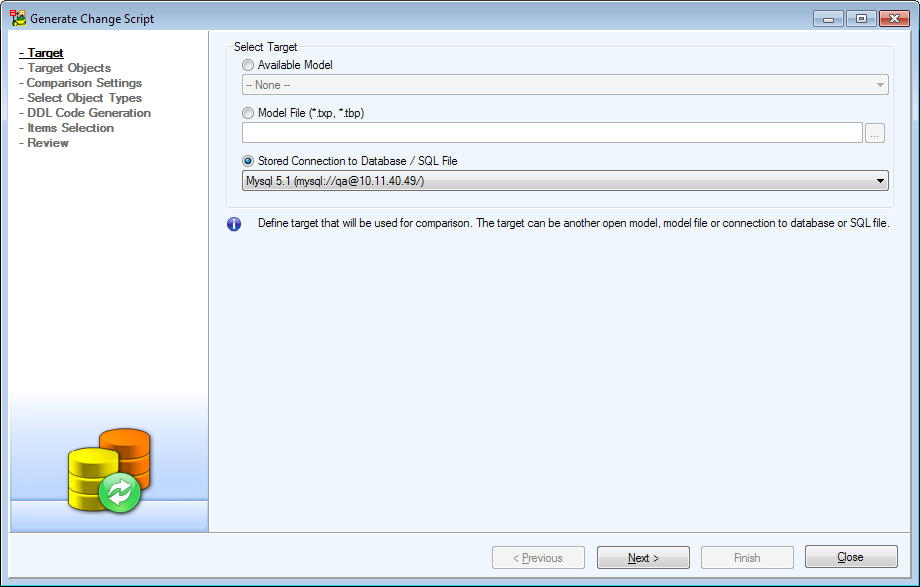 3. If you select a connection to a database or to a DDL file as the target you need to select the target objects you would like to include in your change script. The following buttons and the filter can be used to easily select objects: