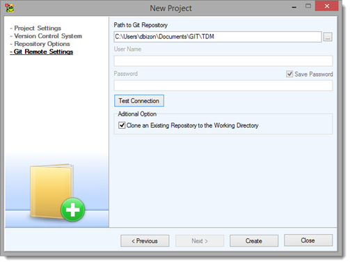 • Enter the path to your local Git repository and check Clone an Existing Repository to the Working Directory if you want to pull the latest files from your remote repository