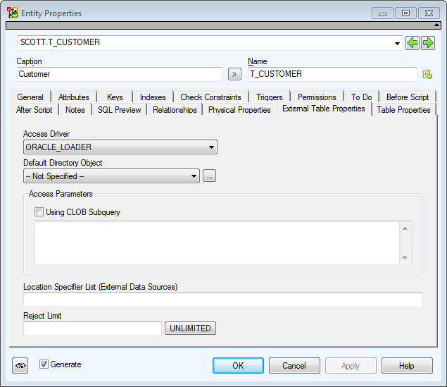 External tables are supported. On tab Physical Properties, select the External Table (Organization External) checkbox. The External Table Properties tab will occur on the form.