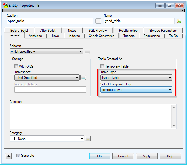 New combo boxTable Type available in Entity Properties dialog, tab General. When the Typed Tableoption is selected, the new combo boxSelect Composite Type appears below the Table Type combo box.Select Composite Type combo box lists all existing User Data Types.