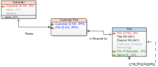 The Order Record entity cannot exist itself. It is dependent on entities Customer and Film. Therefore the Identifying relationship is used. The Order Record entity is a dependent entity, and the Customer ID and Movie ID items are its unique record identifiers.
