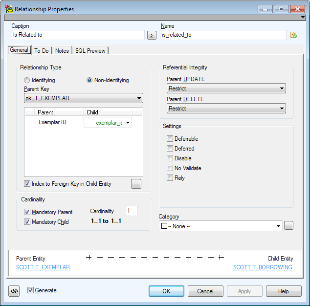 Select this option to set the relationship as identifying or non-identifying. There are also several setting related to Parent and Child entities. The last checkbox gives you the option to create Index to Foreign Key in Child Entity. |