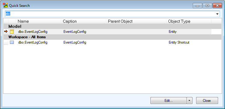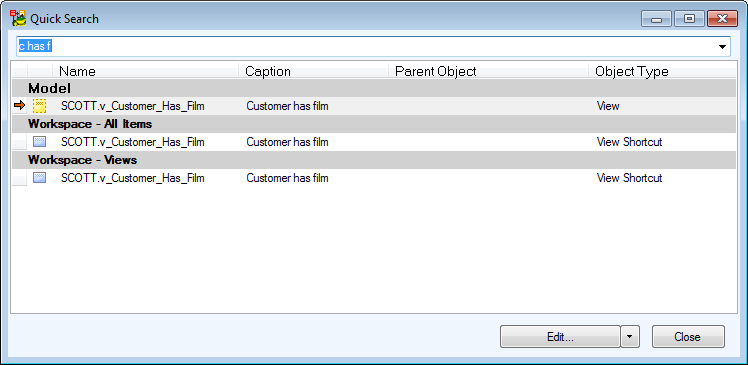 The following example shows search results of string tcr. Results include T_CUSTOMER_RATING.