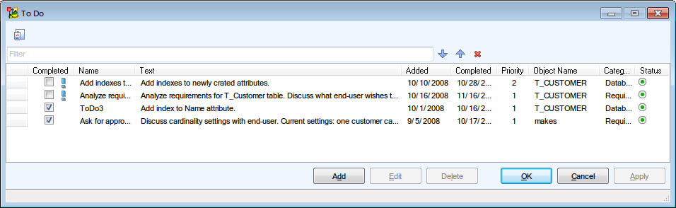 - Particular object of your model in its Properties dialog (see the Entity Properties form | To Do tab)