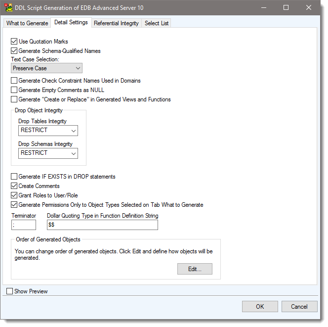 Change Script Generation is based on PostgreSQL 10 and differences between EDB and Postgres might not be generated correctly.