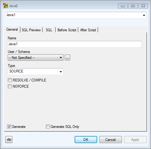 Support for Oracle Java Source, including reverse engineering: All the three types of Java schema objects (SOURCE, CLASS, RESOURCE) should be written to this object. - During reverse engineering only SOURCE types are loaded, and from them only sequences of characters for Java source. Other Java schema objects (CLASS, RESOURCE) are loaded only as a name. Checkbox Generate is unselected for all the Java schema objects (SOURCE, CLASS, RESOURCE).
