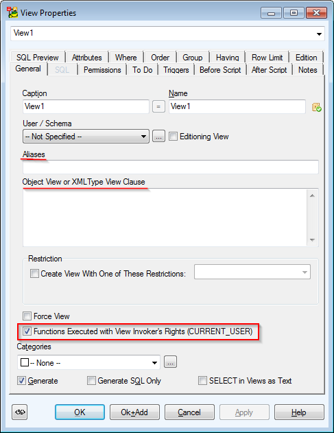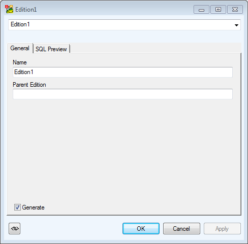 The following objects can refer to the extra object Edition: Synonym, View, Function, Procedure, Package, Type, Trigger. See their Properties dialog and the new tab Edition | In Edition box.