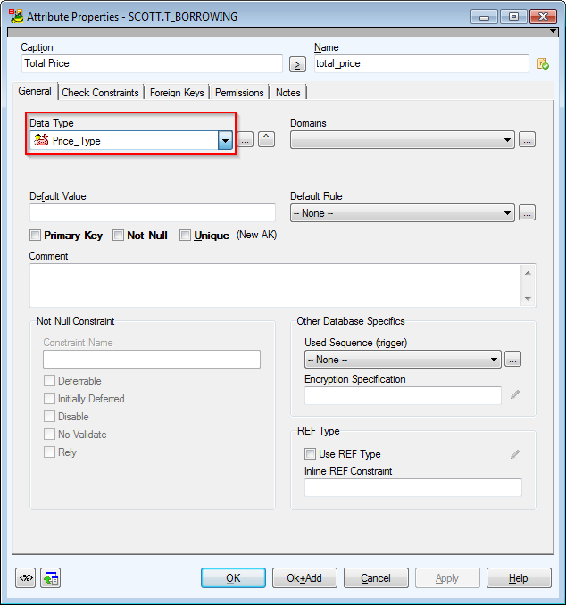 Example: The User Data Type Properties dialog (Oracle 10g)