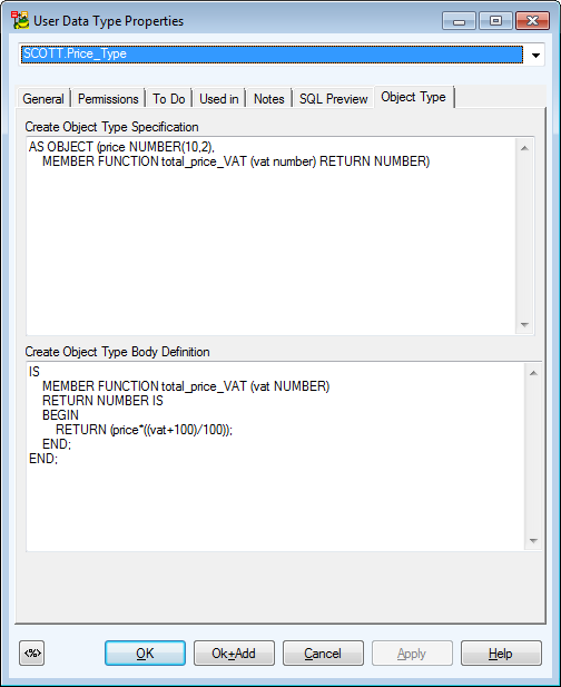 Example: User Data Type Properties dialog | Object Type tab (Oracle 10g)