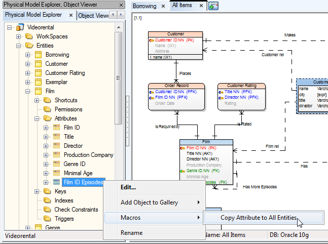 Select an attribute in physical Model Explorer, right-click and select Macros | Copy Attribute to All Entities.