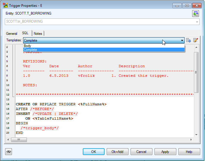 Example: You have created an entity trigger. Edit it and see the SQL tab in the Trigger Properties dialog. The SQL code has been pre-defined = particular default template has been used (according to the database). You don’t have to write the code manually for every new created trigger.