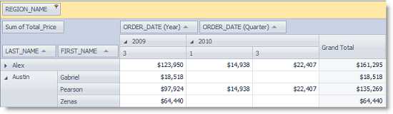 4. Now remove the REGION_NAME field from the Row Area by dragging it back to the field list. Drag the LAST_NAME field to the Row Area. Your pivot now displays total price per customer for each quarter.