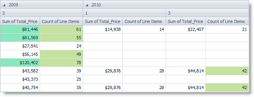 Review your pivot grid and notice how columns are now grouped by year and sub-grouped by quarter, as in the following example.