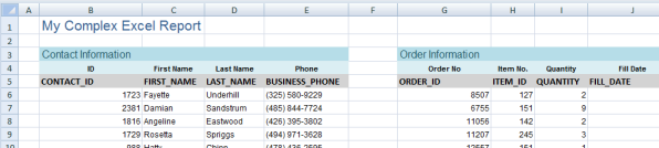 24. Open the new file by clicking the link in the Log tab. The file retains the formatting and headings from your original template and includes the result sets of the two queries inserted into the cell ranges you specified.