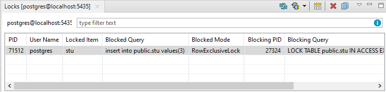 • This view displays all PostgreSQL/EDB database locks . You can observe all blocking and blocked locks of all connected users and also stop the blocking lock with the appropriate privileges.