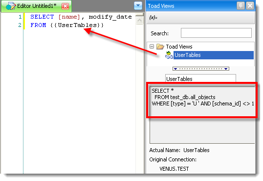 • Unlike code snippets, the contents of a Toad View are not pasted into the Editor. The Toad View name (in curly brackets) is replaced with the view contents only during script execution. This allows you to update the Toad View any time without affecting the script in the Editor.