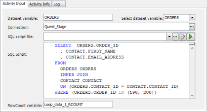 In the Activity Input tab, enter a SQL statement (or select a SQL file) to use as the driving query. When the script executes, the result set of the driving query will be stored in the dataset variable.
