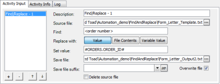 The Find and Replace activity in Automation allows you to customize form reports and emails. You can use the Find and Replace activity in a script to customize a single output or to generate a series of unique reports or emails using your template and inserting information retrieved by a query.