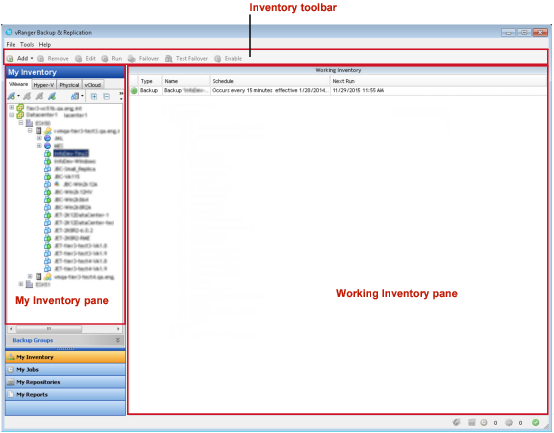 The My Inventory pane offers four tabs — one to show the infrastructure of VMware® VMs, one to show the inventory of Hyper-V® VMs, one for physical servers, and one to show the inventory of VMware vCloud Director® servers.