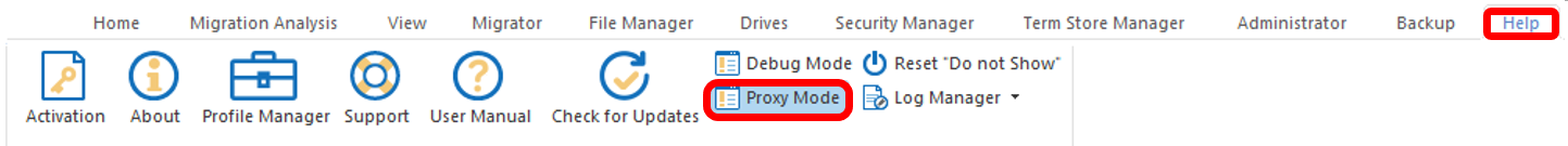 1) In Essentials top ribbon, Click Help | Proxy Mode