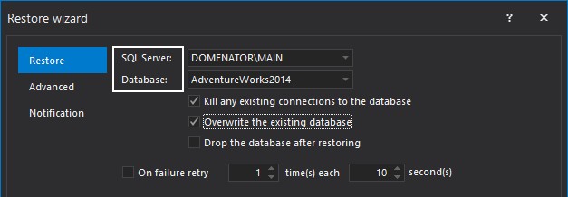 The Restore wizard starts. In Restore tab, choose the server, and the database to restore to. Alternatively, enter the name for a new database to restore to, if existing databases need to be kept for some reason.